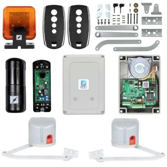 • Dwa siłowniki  ETM-FOLD przeznaczone do automatyzacji bram skrzydłowych na szerokich słupkach. W komplecie z silnikami znajdują się przegubowe ramiona wraz ze sworzniami.