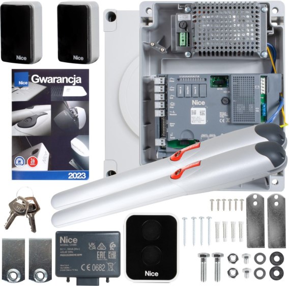 Kompletny zestaw elektromechanicznych siłowników NICE WINGO HI-SPEED 3524 dedykowany do automatyzacji bram skrzydłowych o maksymalnej długości jednego skrzydła wynoszącej 3 metry i maksymalnej masie wynoszącej 200kg, co umożliwia otwieranie bramy dwuskrzydłowej o świetle wjazdu do 6 metrów i łącznej masie skrzydeł do 400kg.